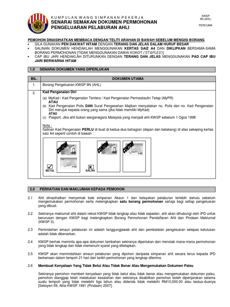 Permohonan tanpa borang ini hanyalah untuk pengeluaran yang berikut. Ahli tidak perlu mengisi Borang Permohonan KWSP 9B AHL kecuali bagi ahli bukan warganegara dan warganegara yang tiada MyKad iaitu pemegang kad pengenalan lama kad pengenalan Polis Tentera pasport. Saya memahami bahawa pengeluaran adalah tertakluk kepada tarikh penerimaan permohonan saya oleh kwsp dan baki simpanan di dalam akaun 2 saya semasa pembayarandibuat.